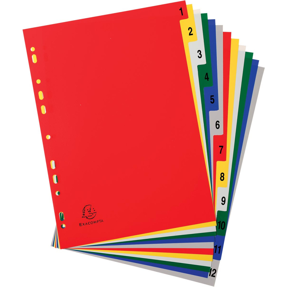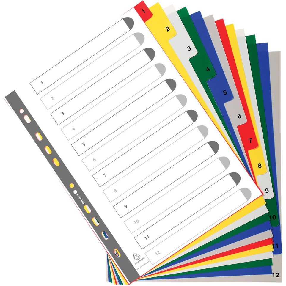 Intercalaires numériques Exacompta pour documents au format A4, composés de 12 onglets colorés. Conviennent à l’organisation rapide de dossiers, rapports ou archives en environnement scolaire, professionnel ou administratif.