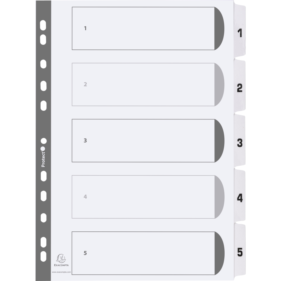 Intercalaires imprimés à touches plastifiées - 5 touches 1 à 5 - A4 Onglets imprimés recto verso pour une navigation plus rapide entre les différentes sections. Page d'indexation renforcée et imprimable gratuitement avec Kreaman® sur www.exacompta.com Perforations et touches blanches renforcées.