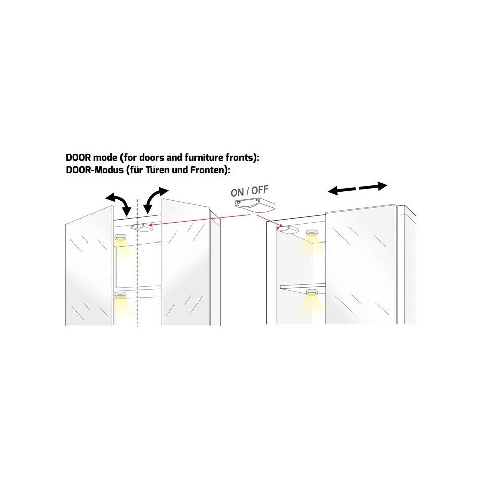 Deux modes : mode Porte pour ouverture/fermeture de portes, mode Move pour détection de mouvement de la main et variation de lumière.