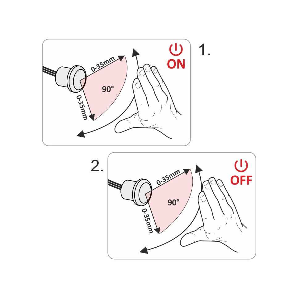 Installer le détecteur dans un meuble ou sous une surface appropriée. L’éclairage connecté s’allume ou s’éteint automatiquement lorsqu’un mouvement est détecté dans la zone de 35 mm et sur un angle de 90°, sans nécessité de toucher l’appareil.