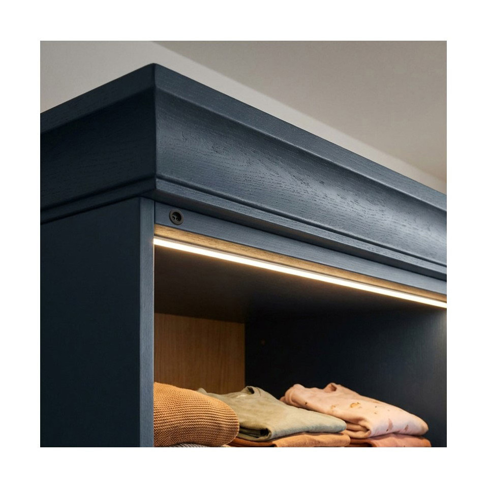 L'interrupteur NEXO s'installe dans le meuble et détecte la présence ou l'absence de la porte grâce à son capteur infrarouge. L'ouverture de la porte déclenche automatiquement l'éclairage LED, tandis que la fermeture l'éteint, sans aucune manipulation manuelle.