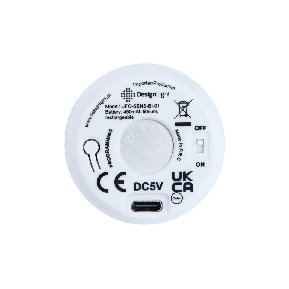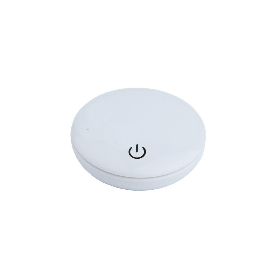 L'interrupteur tactile OVNI RF blanc est un capteur sans fil conçu pour contrôler et graduer l'éclairage LED dans les meubles, fonctionnant en 12 ou 24V DC.