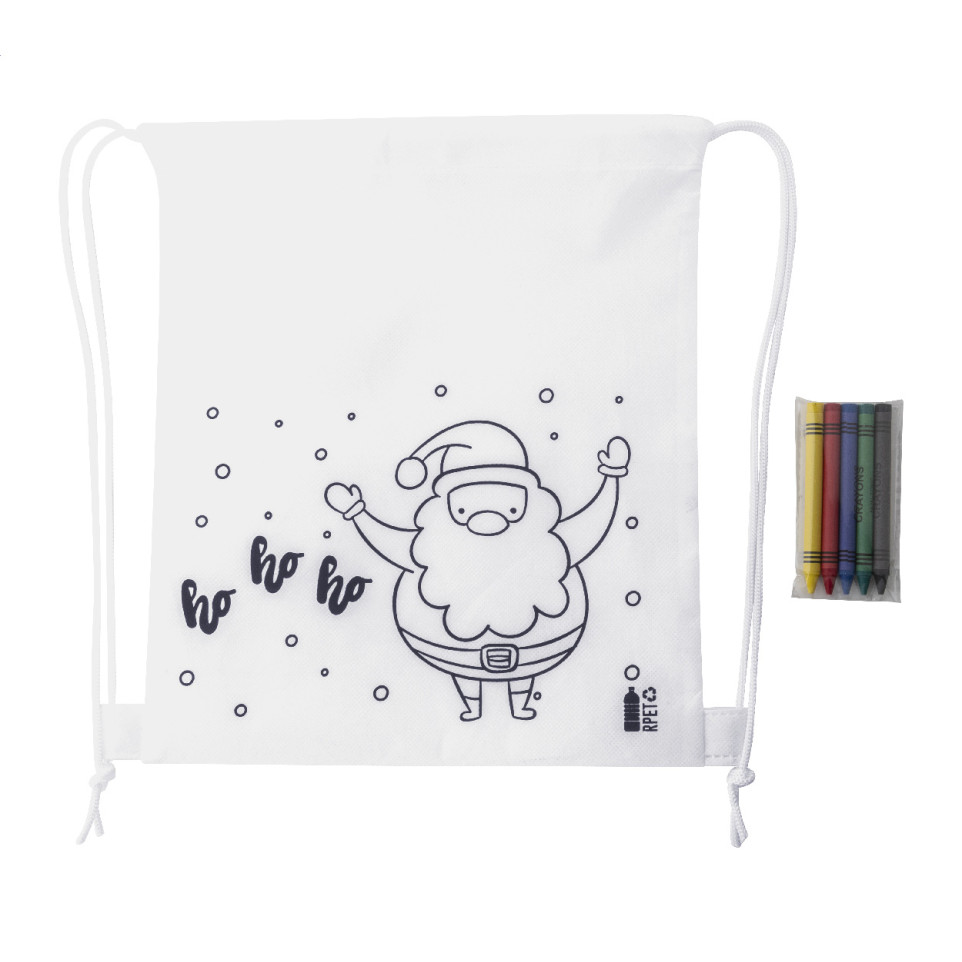 Sac piscine de Noël à colorier, conçu en RPET non tissé blanc, livré avec 5 crayons. Pratique pour offrir lors de fêtes de fin d’année, il invite à la créativité et à l’amusement pour petits et grands.