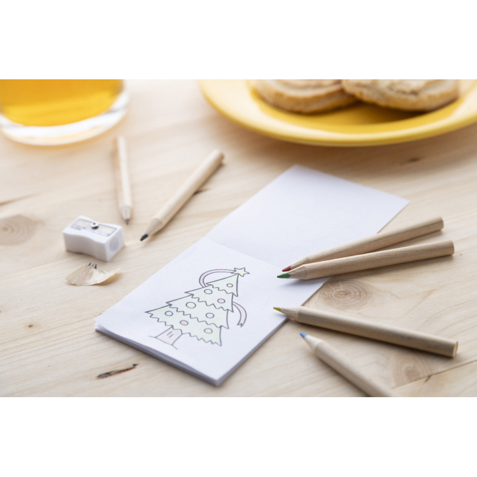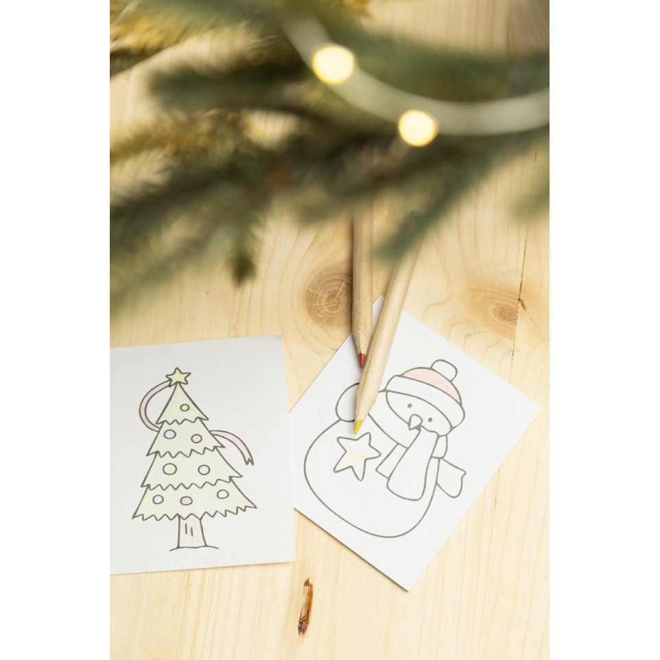 Set de coloriage de Noël parfait pour stimuler la créativité des enfants pendant les fêtes, incluant 6 crayons de couleur en bois, un taille-crayon et un livret de coloriage rangés dans une boîte en papier kraft pratique.