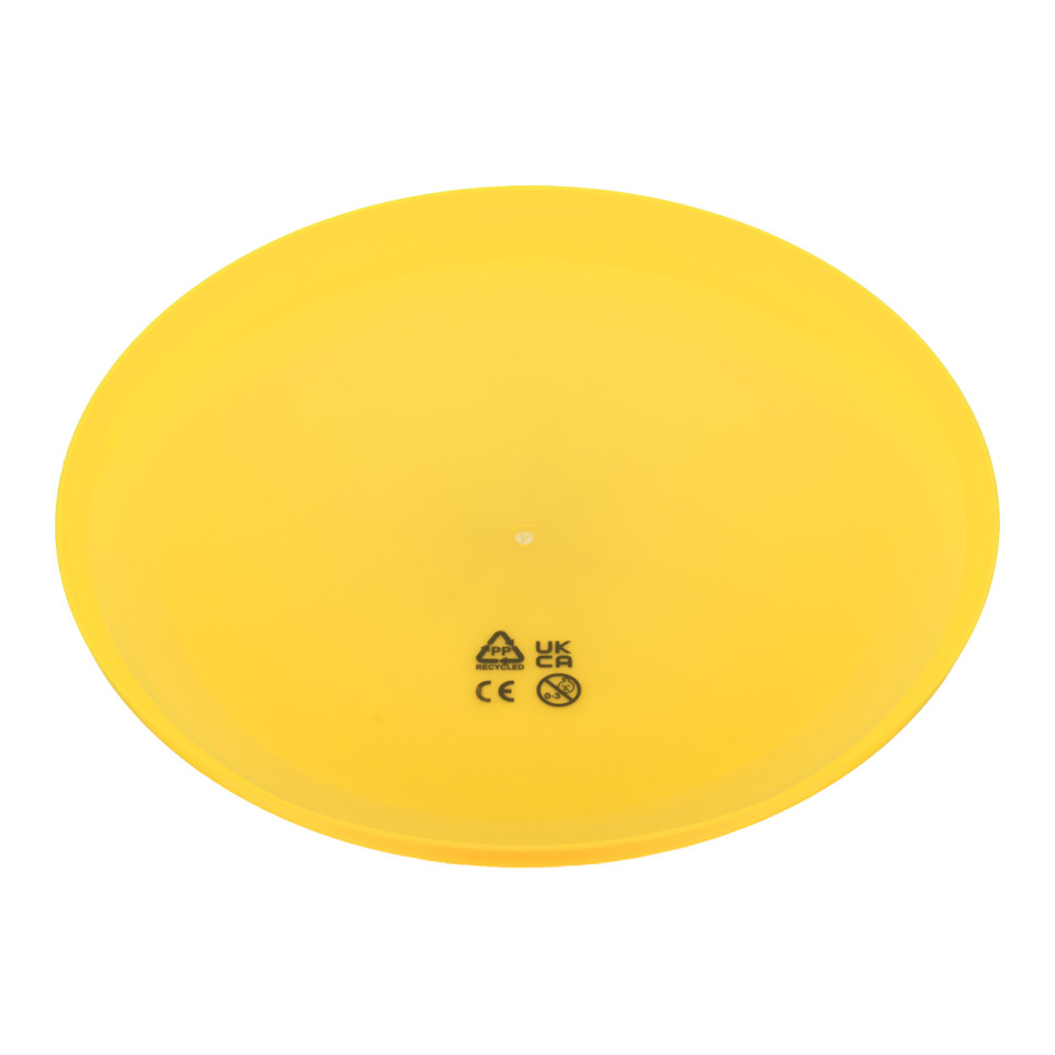Frisbee de plage en plastique PP recyclé, couleur jaune vif, conçu avec une surface plane idéale pour une trajectoire régulière et précise. Parfait pour le jeu en extérieur, notamment sur la plage, entre amis ou en famille.