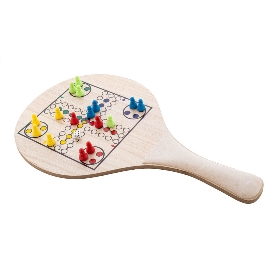Set de tennis de plage composé de deux raquettes en bois et plastique écologique à base de paille de blé, accompagné d’une balle et de trois jeux de société intégrés à jouer sur les raquettes. Livré dans une pochette en coton pratique.