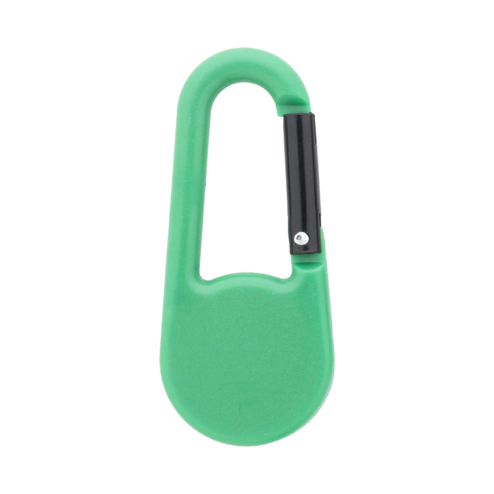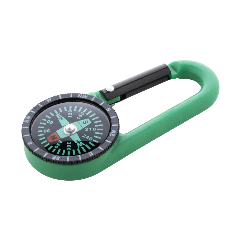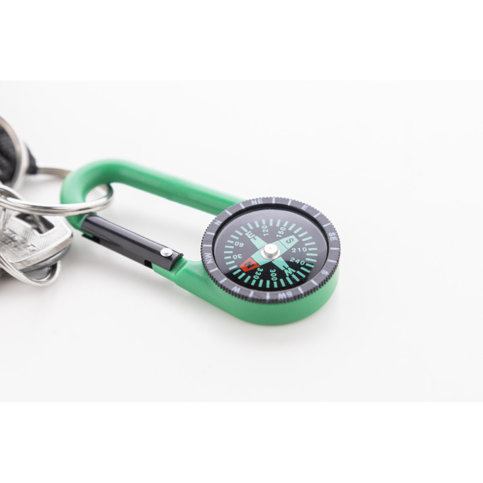 Mousqueton vert et noir en plastique équipé d’une boussole intégrée, pratique pour attacher et localiser rapidement des objets lors de randonnées, d’événements sportifs ou de déplacements urbains.