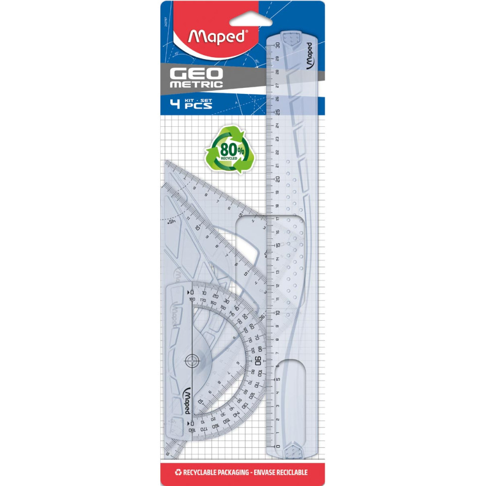 Le kit de dessin Geometric Maped 242767 réunit 4 instruments essentiels pour le traçage géométrique : une latte de 30 cm, deux équerres (45° et 60°, 21 cm chacune) et un rapporteur 180° de 12 cm. Idéal pour les élèves et étudiants en mathématiques, technologie ou dessin technique.