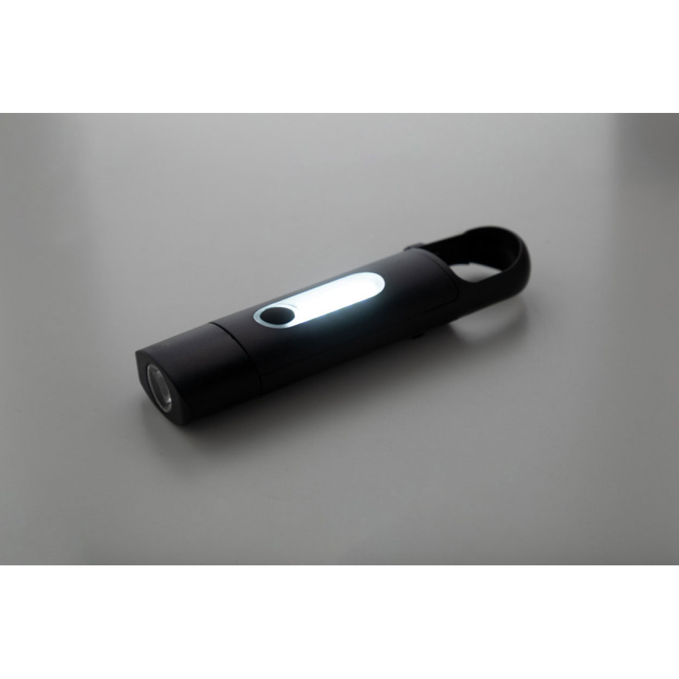 Mini lampe de poche compacte en ABS recyclé, idéale pour avoir une source lumineuse fiable à portée de main lors de déplacements, activités outdoor, ou dans la vie quotidienne. Son format réduit facilite le transport sur un porte-clés, un sac ou une ceinture.