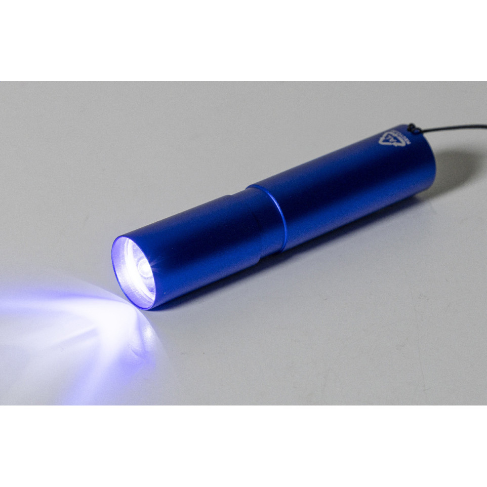 Lampe de poche compacte en aluminium recyclé, coloris bleu, équipée d'une batterie rechargeable USB intégrée de 400 mAh et d'une dragonne pratique. Idéale pour un usage quotidien, au bureau comme en déplacement.