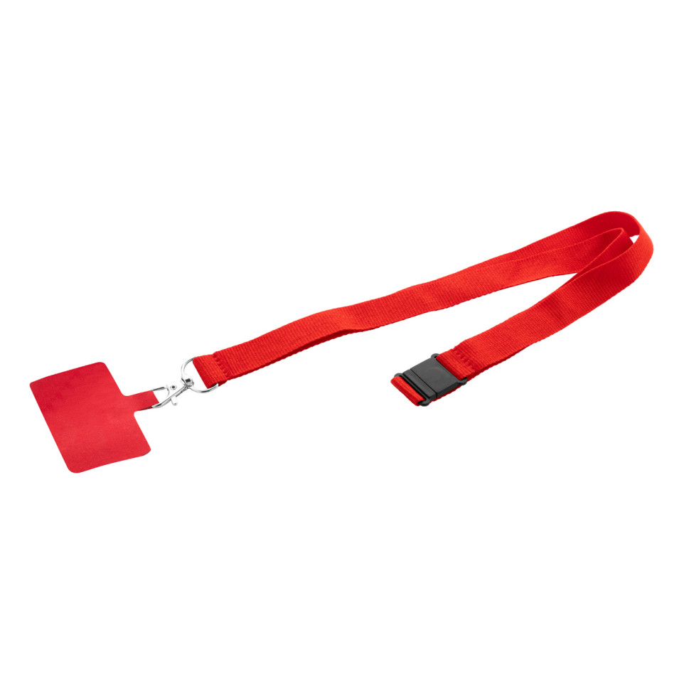 Tour de cou support pour téléphone portable en RPET avec mousqueton en métal, boucle de sécurité et insert pour téléphone de couleur rouge. Accessoire pratique pour garder votre smartphone à portée de main lors de vos déplacements.