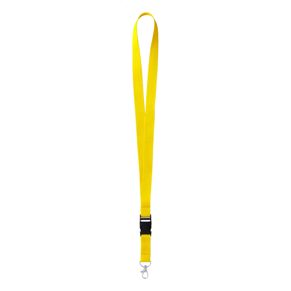 Tour de cou jaune en polyester doté d’un mousqueton amovible en métal, idéal pour porter des badges, clés ou cartes d’accès lors d’événements, en entreprise ou dans les lieux publics.