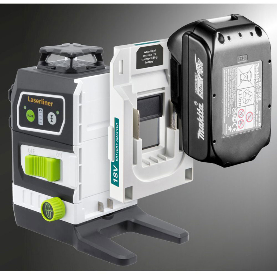 Insérez l’adaptateur correspondant à la marque de votre batterie 18V sur le laser 3G Multi-18V Laserliner, puis fixez votre batterie pour garantir une alimentation stable et sécurisée. Le système permet d’alterner rapidement entre différents parcs de batteries sur chantier, optimisant la flexibilité d’utilisation du laser.