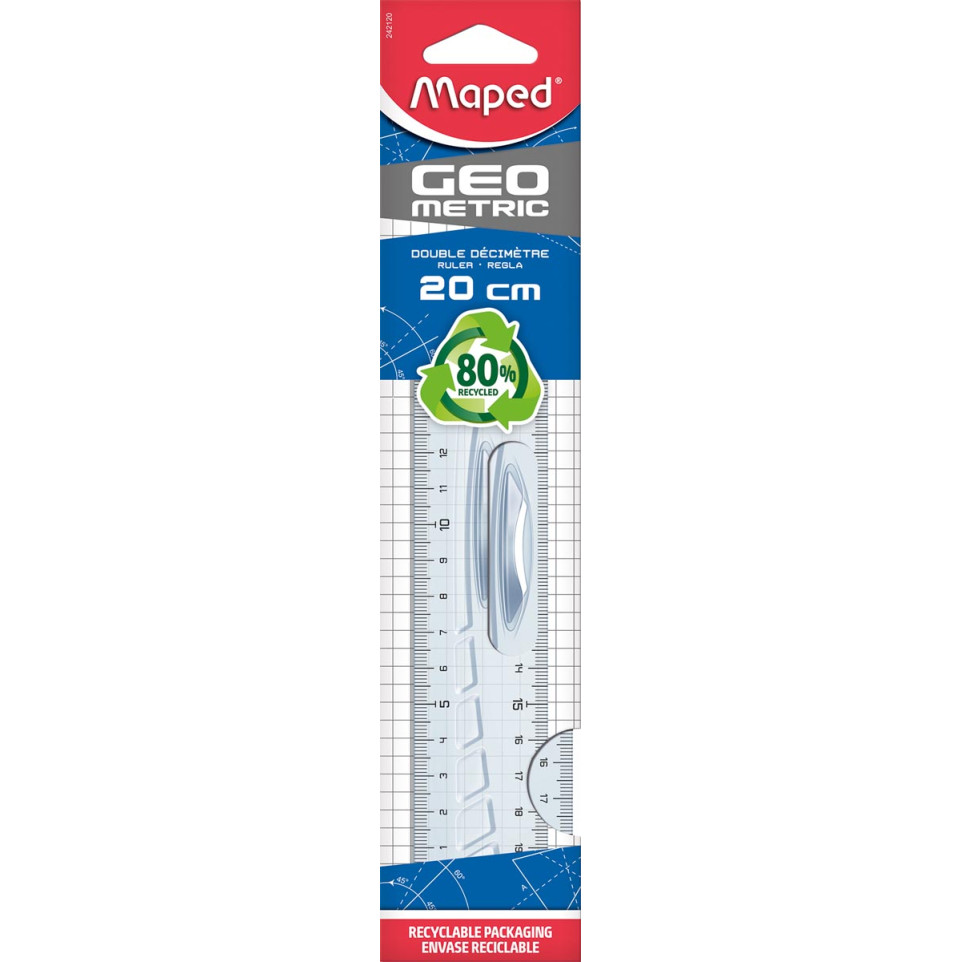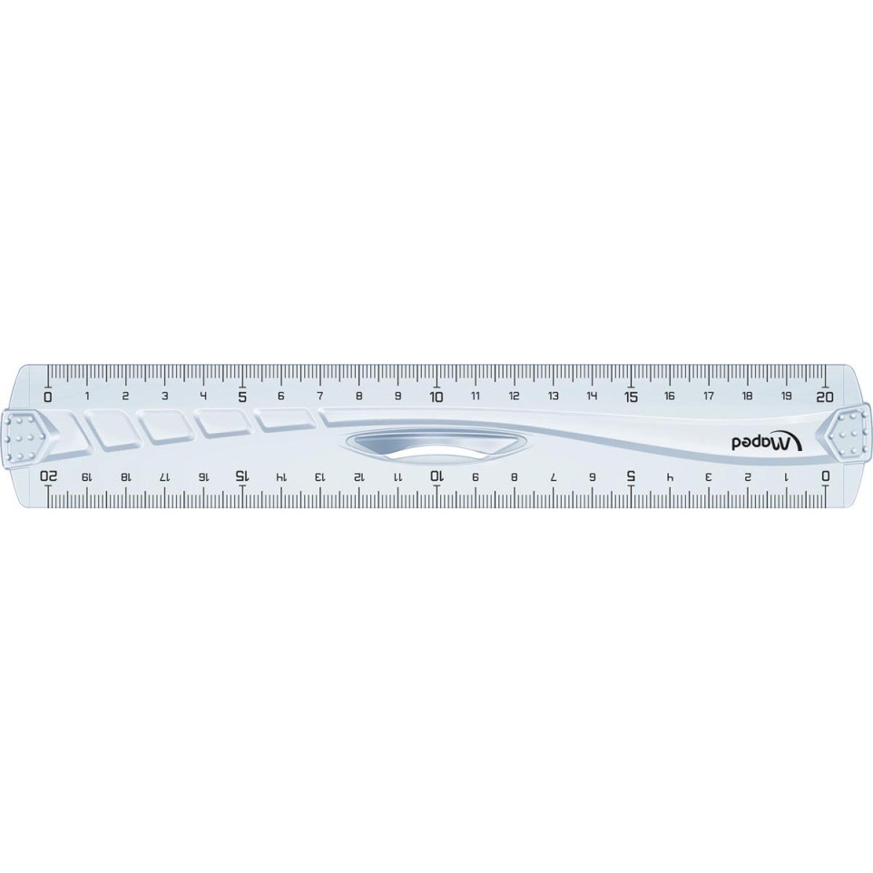 Double décimètre Maped Geometric de 20 cm, conçu en plastique transparent, idéal pour les mesures précises en milieu scolaire ou professionnel. Pratique et ergonomique, il s’intègre facilement dans les trousses et cartables.