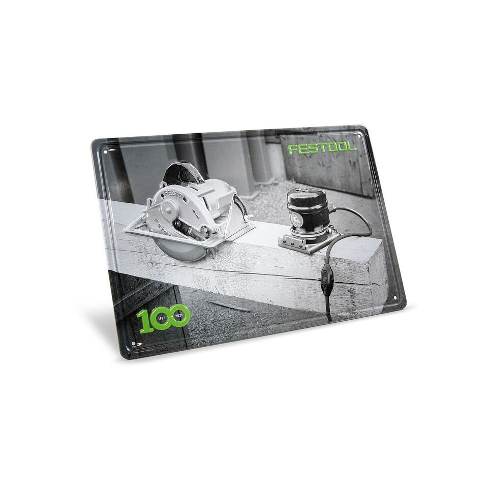Plaque en tôle rétro signée Festool, édition limitée créée pour le centenaire de la marque. Parfaite pour décorer un atelier, un espace professionnel ou une collection, elle met à l’honneur le design emblématique des machines Festool.