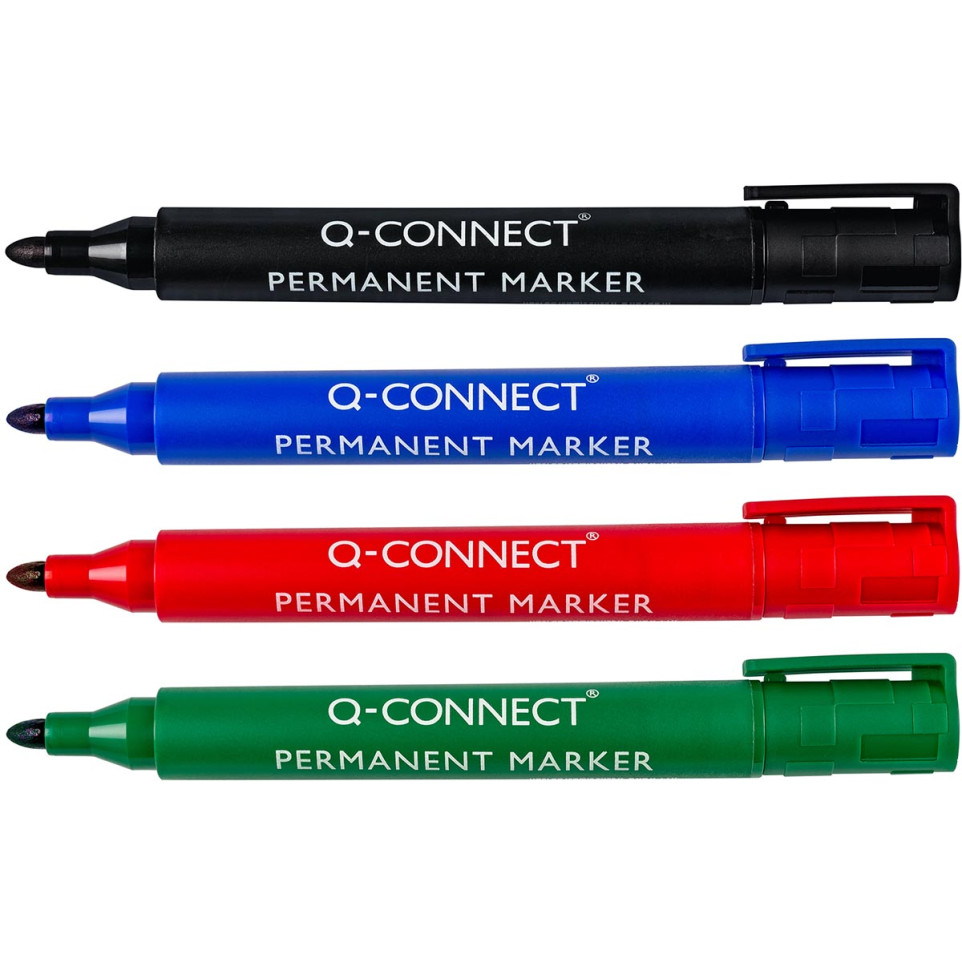 Marqueur permanent Q-CONNECT, conçu pour l'écriture ou le marquage sur la plupart des surfaces. Pointe ronde, largeur de trait 2 à 3 mm. Étui de 4 pièces avec couleurs assorties : 2 noirs, 1 rouge, 1 bleu.