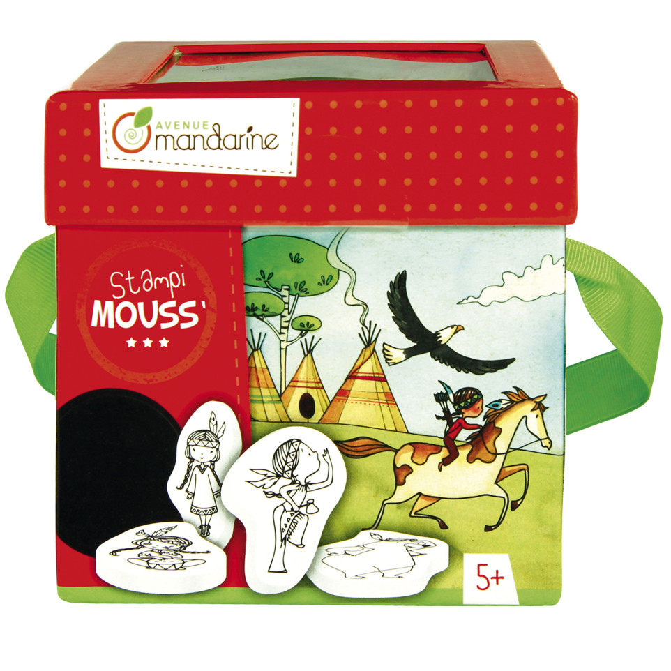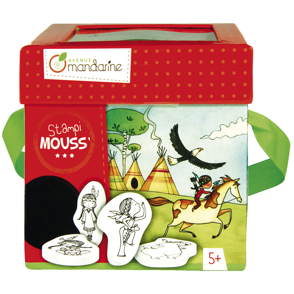 * Stampi' Mouss, Indiennes Un bien joli coffret à offrir ou a conserver ! Boite en carton rigide, pratique et colorée contenant 10 tampons, 1 encreur et 10 cartes décors à colorier. Encre lavable à l'eau. Des jolis tampons pour compléter un dessin, imaginer mille et une histoires... A partir de 5 ans. Conforme aux normes CE.
