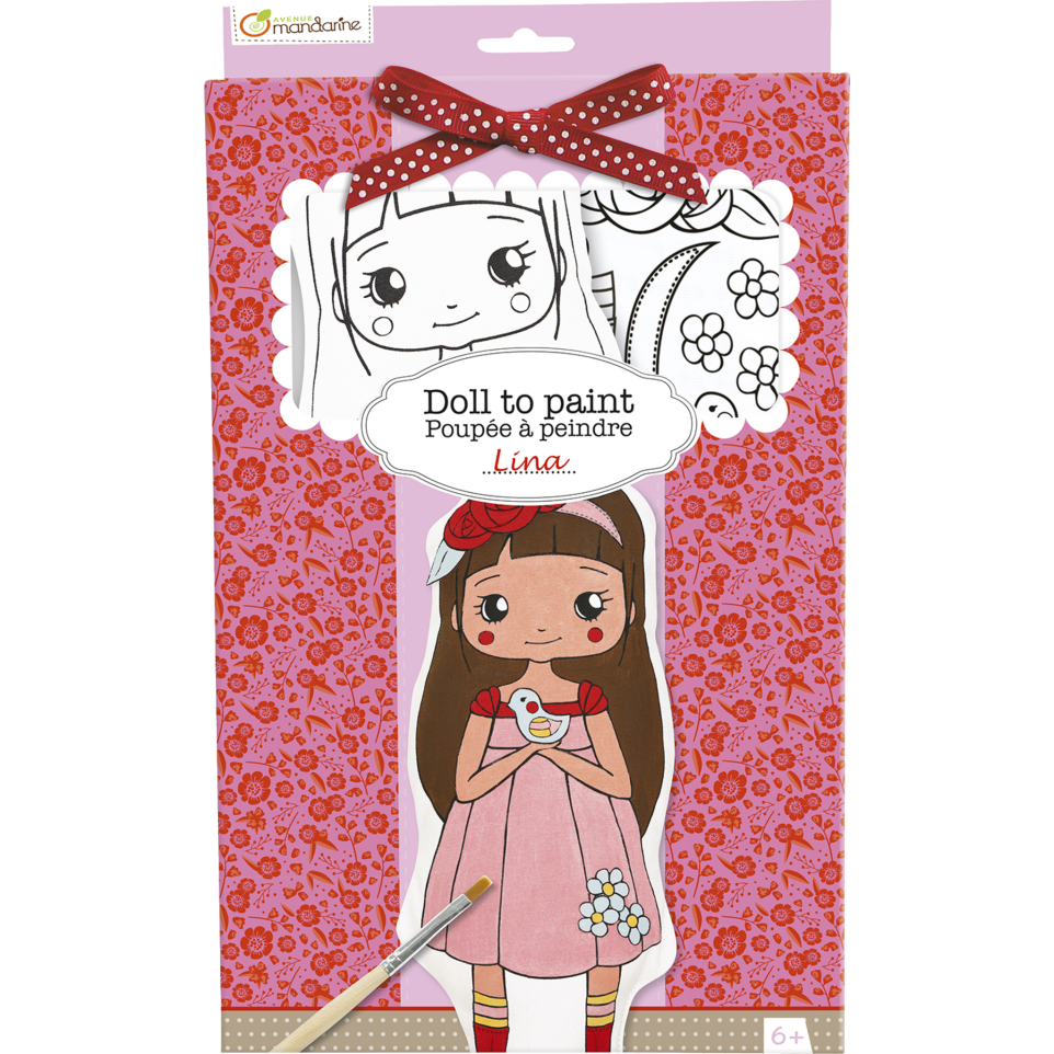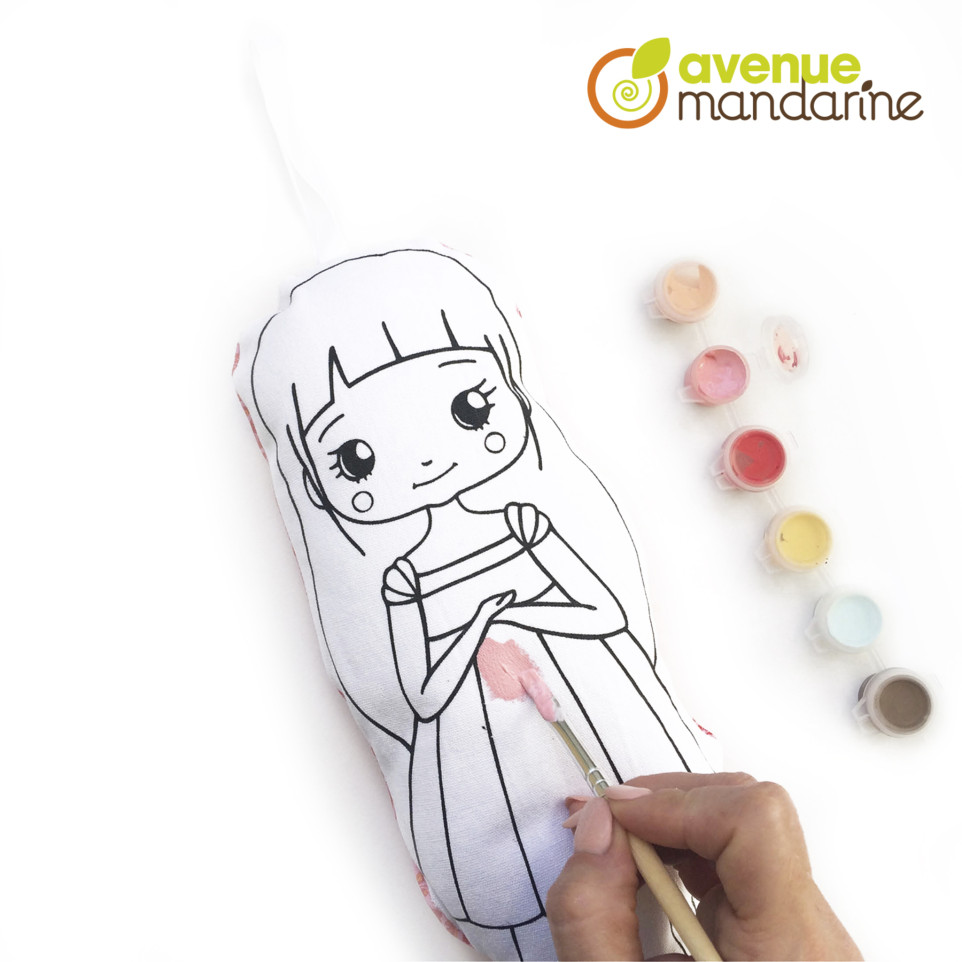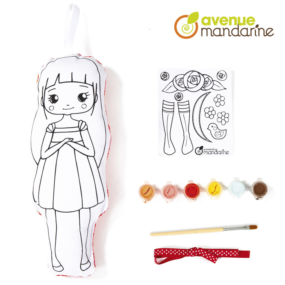 * Poupée à peindre Lina Une jolie poupée en coton imprimé (H. 28 cm) à peindre et customiser avec le kit de 6 flacons de peinture acrylique et les accessoires (ruban, pinceau..) inclus dans le coffret. Une activité originale et créative en exclusivité chez Avenue Mandarine ! A partir de 6 ans. Contient: 1 poupée à peindre en tissu (motif imprimé au dos de la poupée), 1 planche adhésive en tissu à peindre, 6 flacons de peinture acrylique, 1 pinceau et 50 cm de ruban. Conforme aux normes CE Notice de montage incluse.