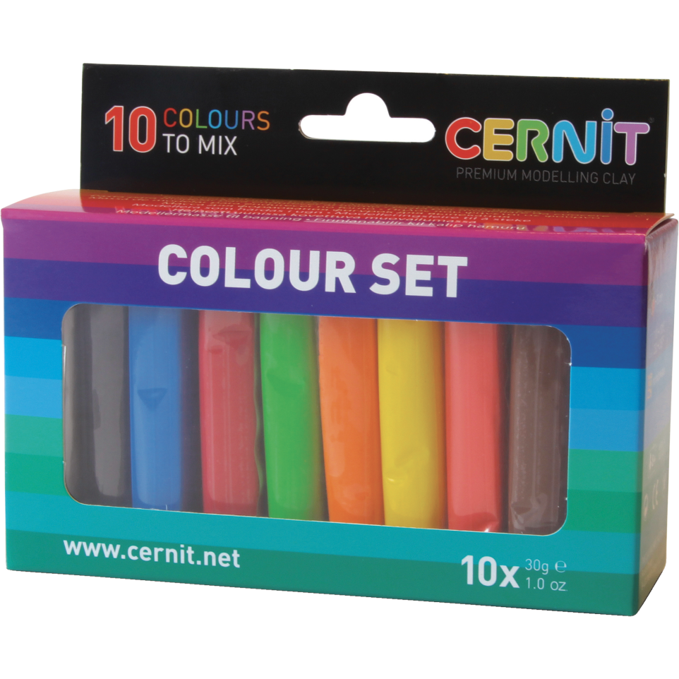 Cernit Multicolour set 10 x 30 g NUMBER ONE : Pâte à modeler à cuire (polymère). Complètement opaque après cuisson. Aucune variation de teinte. La gamme Number One est adaptée à toutes les techniques. Elle permet de faire des dégradés ou des démarcations strictes entre plusieurs teintes. CUISSON : Faire cuire la pâte entre 110°C (230°F) et 130°C (266°F) dans un four traditionnel pendant 30 minutes maximum. Sans odeur à la cuisson. Ne se fissure pas. Ne pas utiliser de four micro-ondes. Après cuisson, la pâte est dure mais peut encore être travaillée (poncée, peinte, etc.). CARACTÉRISTIQUES : Ne sèche pas. Après cuisson, la pâte est complètement solide mais reste flexible. Sans odeur, la pâte est agréable à travailler et reste malléable à l'infini. Elle ne déteint pas ni sur les mains, ni sur les outils. Toutes les couleurs peuvent se mélangées afin d'obtenir la teinte souhaitée. Végan. UTILISATIONS : Idéales pour créer des bijoux, des reproductions, des miniatures, des personnages etc. Toujours travailler la pâte avec les mains propres sur une surface préalablement nettoyée. Malaxer la pâte pour la rendre plus souple avant d'être travaillée. Elle peut être sculptée, moulée, imprimée ou utilisée avec d'autres matériaux comme des pierres, perles, plumes. Possibilité de rajouter des additifs comme des paillettes, de l'encre à alcool etc. à l'intérieur de la pâte avant cuisson. POIDS : 30g. FABRICATION : Toutes les pâtes à modeler à cuire Cernit sont fabriquées en Belgique, près de Liège.