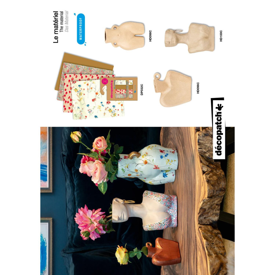Vase buste 18x11,5x29 cm MULTI-TECHNIQUES : Ce vase peut être décoré selon vos envies à l'aide de papiers Décopatch, de peinture acrylique, de paillettes, de stickers et ou gardé tel quel pour un côté kraft naturel. Les possibilités sont infinies ! DECORATION DIY : Waterproof, un vase vraiment original à customiser selon votre déco ou la plante à l'intérieur. Ne craint pas l'eau - Action renforcée par notre vitrificateur extérieur Aquapro (non fourni). TECHNIQUE DECOPATCH : Déchirez ou découpez quelques morceaux de papier Décopatch d'environ 2x2 cm - Appliquez la colle sur le support. Déposez un morceau de papier sur la surface encollée et mettre une deuxième couche de colle dessus. Superposez les morceaux de papier pour recouvrir le support en mixant les couleurs et les motifs. CARACTERISTIQUES : Ce vase waterproof est fabriqué à la main à base papier mâché de couleur brun, chaque support est donc unique. Dimensions : 18x11,5x29 cm. CREE EN FRANCE : Décopatch est une marque française appartenant au groupe Clairefontaine Rhodia. Située en banlieue lyonnaise, une équipe de passionnés cherche sans cesse de nouvelles idées pour répondre aux tendances de customisation, de décoration et de loisirs-créatifs.
