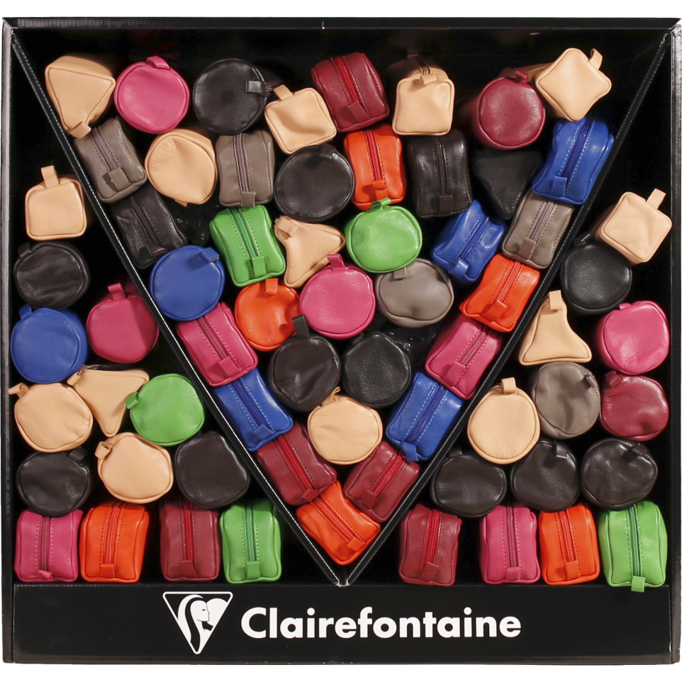 Présentoir de 66 trousses cuirs. Trousses en véritable cuir d'agneau, souple et agréable au toucher. Le tannage est végétal aux extraits entre autres de mimosa et quebracho et sans chrome ni arsenic afin de préserver l'environnement ainsi que les opérateurs sur place. Cette trousse convient pour une utilisation scolaire ou pour y mettre des objets utiles au quotidien. Composition en fonction du stock, trousses en différents formats et couleurs.