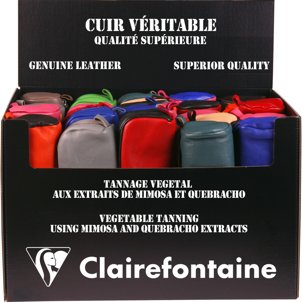 Présentoir de 24 trousses cuirs en assortis de couleurs et de formats,. En véritable cuir d'agneau, souple et agréable au toucher. Le tannage est végétal aux extraits entre autres de mimosa et quebracho et sans chrome ni arsenic afin de préserver l'environnement ainsi que les opérateurs sur place.