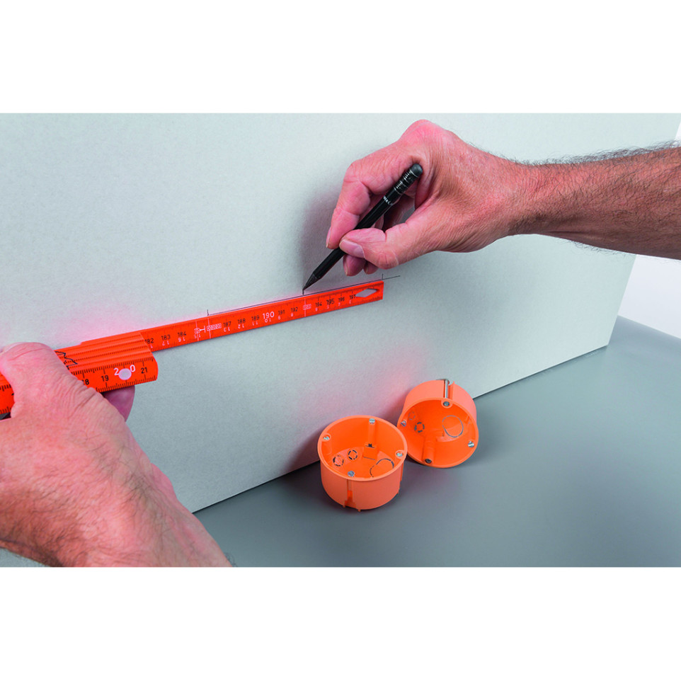 Dépliez le mètre selon la distance à mesurer. Positionnez-le pour marquer l’écartement exact des boîtiers d’encastrement ou pour guider l’introduction des câbles. Idéal pour les passages dans les murs, il offre fiabilité et rapidité sur tous vos chantiers électriques.