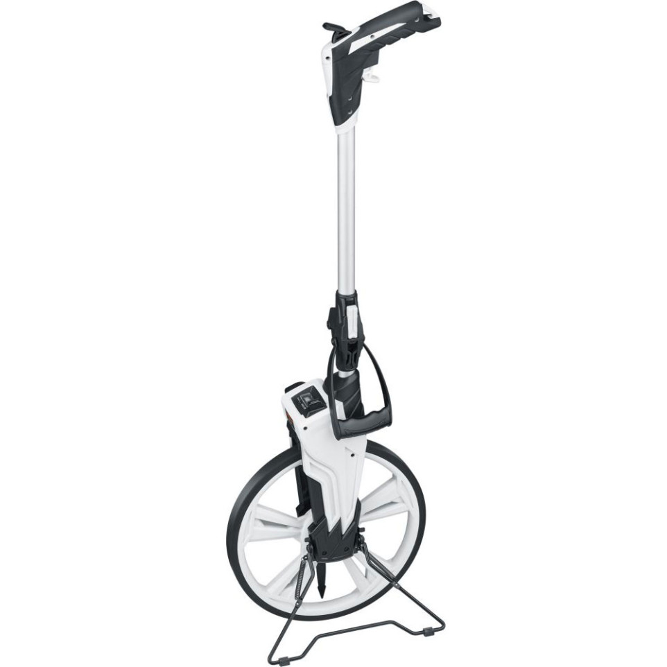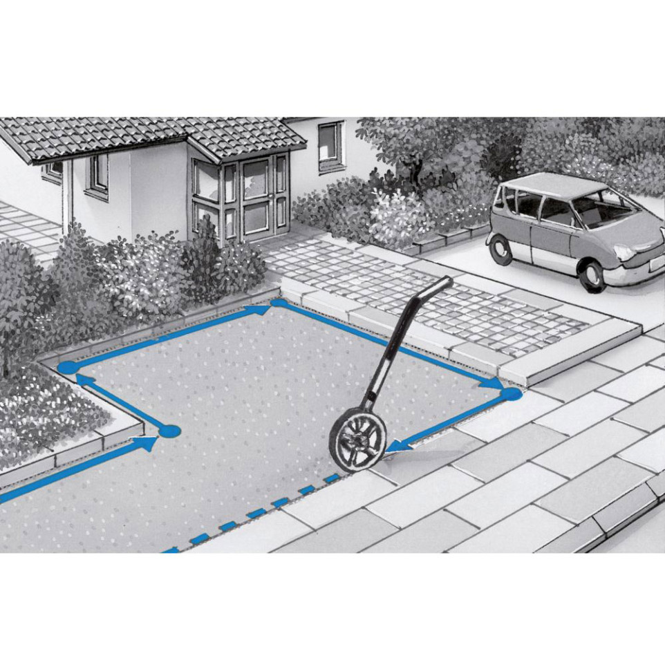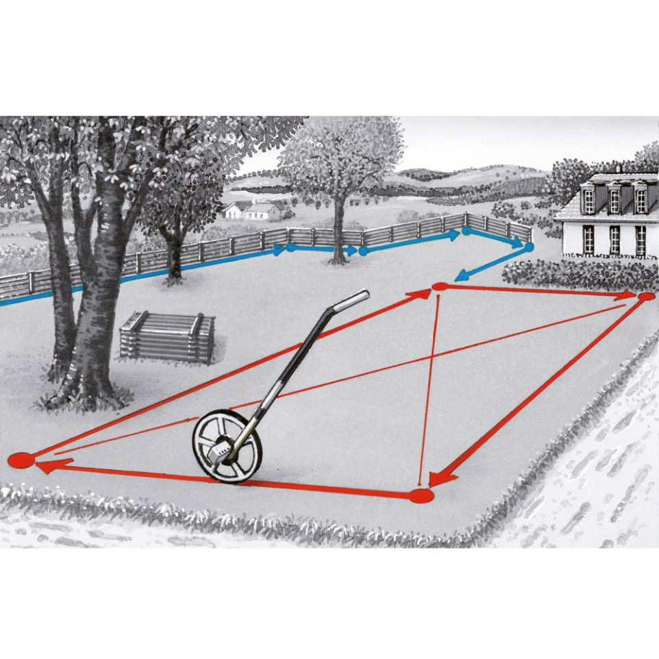 Odomètre à roue mécanique permettant de mesurer des distances précises jusqu'à 9 999,9 mètres sur lignes droites et courbes, doté d'un affichage analogique avec aiguille mobile.