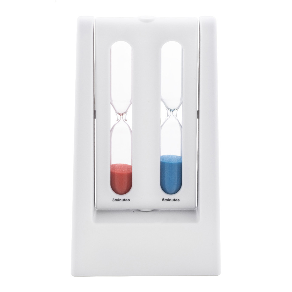 Minuteur de cuisine bitemp sablier en ABS blanc recyclé, idéal pour mesurer avec précision des intervalles de 3 et 5 minutes grâce à ses deux sabliers rotatifs. Convient pour la cuisine, le thé ou les temps d’attente courts.