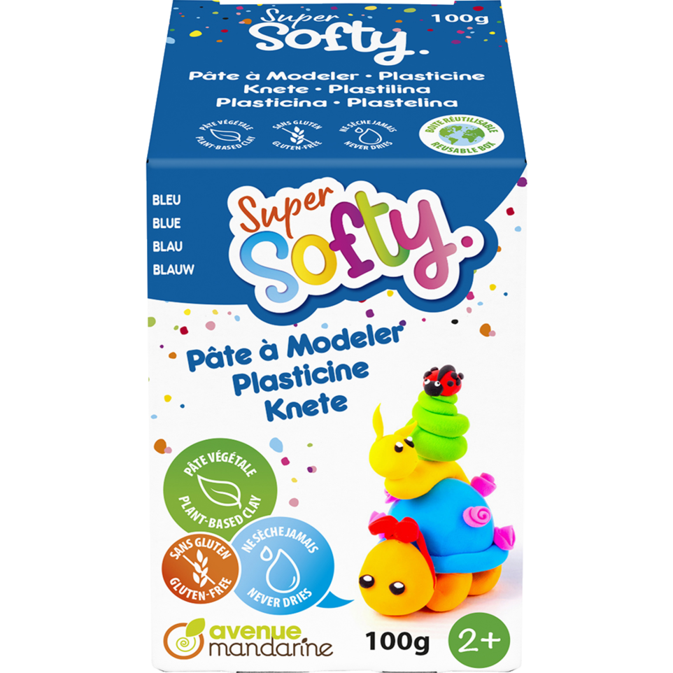 Boîte Super Softy 100g, Bleu Pain de 100g de pâte à modeler extra souple de couleur bleue. Cette pâte à modeler ne sèche jamais, elle sera souple à vie, peut être réutilisée à l'infini. Texture ferme, pâte est très malléable qui ne salit pas les mains. Les 10 teintes de la gamme SOFTY sont miscibles. La pâte à modeler SUPER SOFTY est une pâte végétale à base de cire/vaseline, amidon de maïs. Sans OGM, sans gluten et sans conservateur. Hypoallergène. La pâte à modeler SUPER SOFTY est idéale pour la plastilinographie et peut également être utilisée pour la peinture aux doigts, les travaux au pochoir et toutes les techniques nécessitant de gribouiller la pâte comme une peinture. Pour les enfants à partir de 2 ans, idéale dès la crèche. Fabriquée en Belgique.