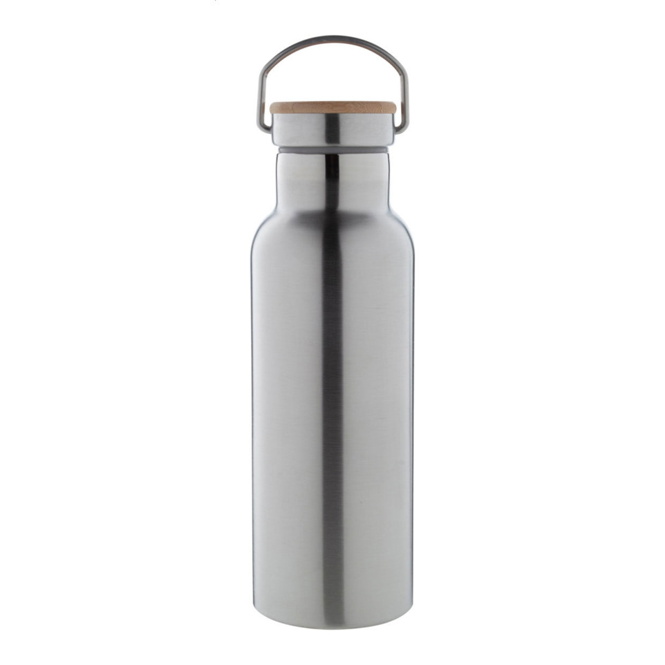 Gourde isotherme à double paroi en acier inoxydable avec élégant couvercle en bambou. D'une capacité de 500 ml, cette bouteille Manaslu argentée conserve vos boissons à la température idéale pendant vos déplacements quotidiens.