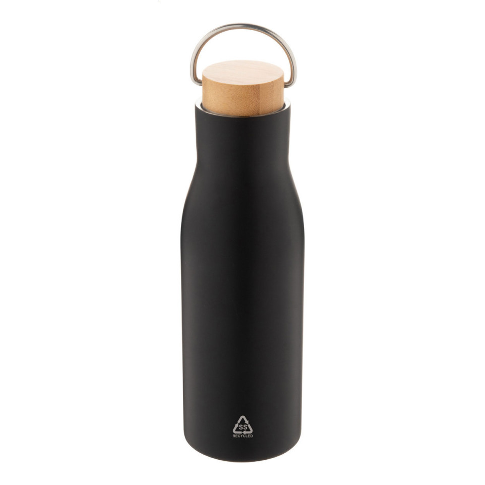 Bouteille isotherme de 500 ml en acier inoxydable recyclé à double paroi, équipée d’un couvercle en bambou naturel. Elle conserve durablement la température de vos boissons, chaudes ou froides, idéale au bureau, en déplacement ou pour vos activités quotidiennes.