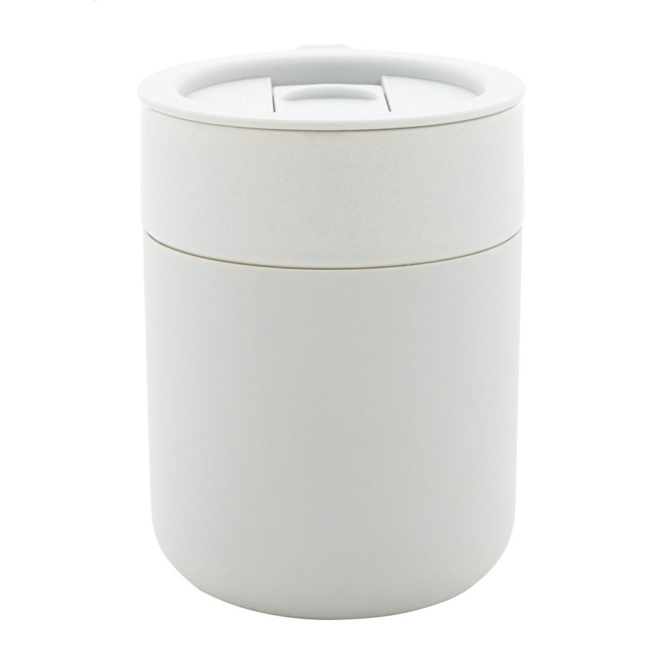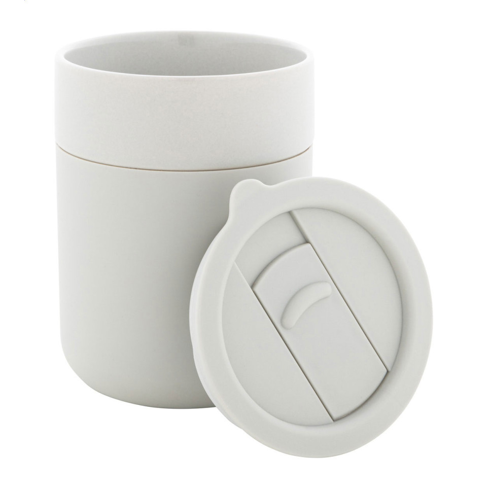 Mug de voyage Liberica gris en céramique, recouvert de silicone pour une meilleure prise en main, doté d’un couvercle en plastique PP, capacité de 300 ml. Pratique pour emporter vos boissons chaudes ou froides lors de vos déplacements.