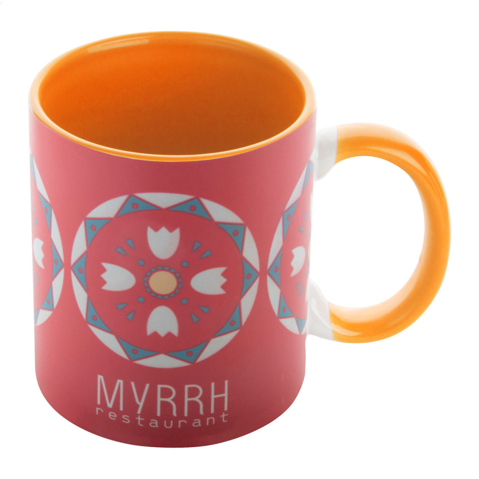 Mug en céramique orange/blanc de 350 ml, conçu pour la sublimation, livré dans une boîte cadeau. Parfait pour personnaliser vos pauses-café au bureau ou vos opérations de communication.