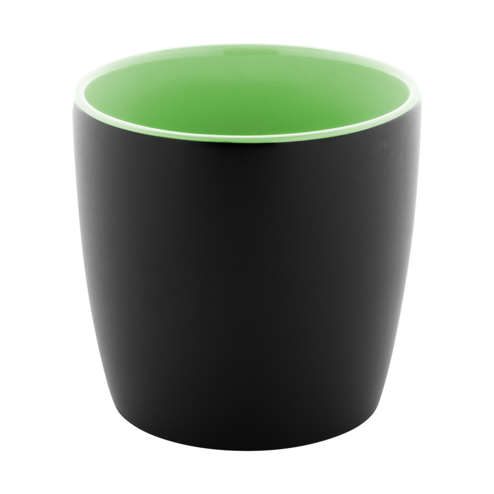 Mug en céramique haut de gamme de 300 ml, finition extérieure noire mate et intérieur vert brillant. Idéal au bureau, à la maison ou pour vos événements promotionnels. Livré dans une boîte en papier kraft.