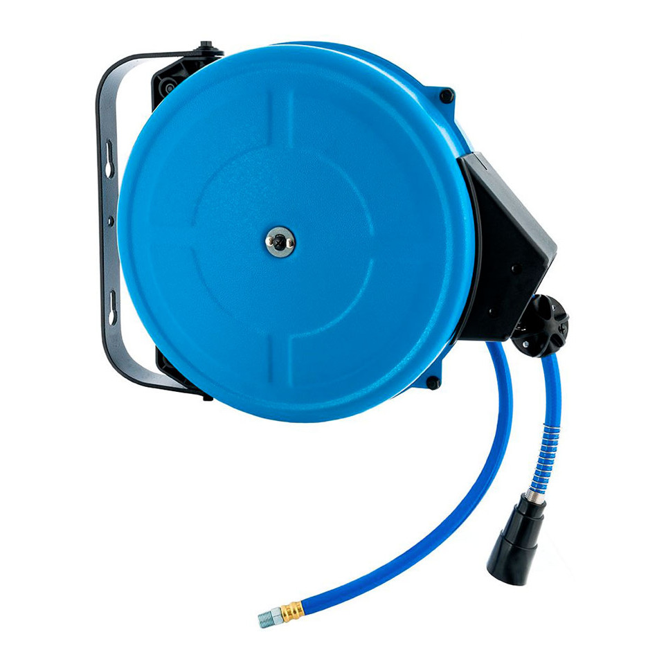 Enrouleur mural pour air comprimé conçu pour un usage professionnel et domestique, idéal pour alimenter vos outils pneumatiques dans l’atelier ou le garage grâce à un tuyau flexible de 15 mètres.