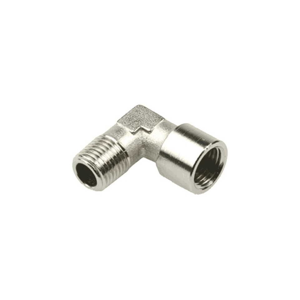 Coude pneumatique standard équipé d'une connexion mâle 1/4" et d'une connexion femelle 1/4", conçu pour assembler, orienter ou prolonger des circuits d'air comprimé dans les installations industrielles ou les ateliers de bricolage.