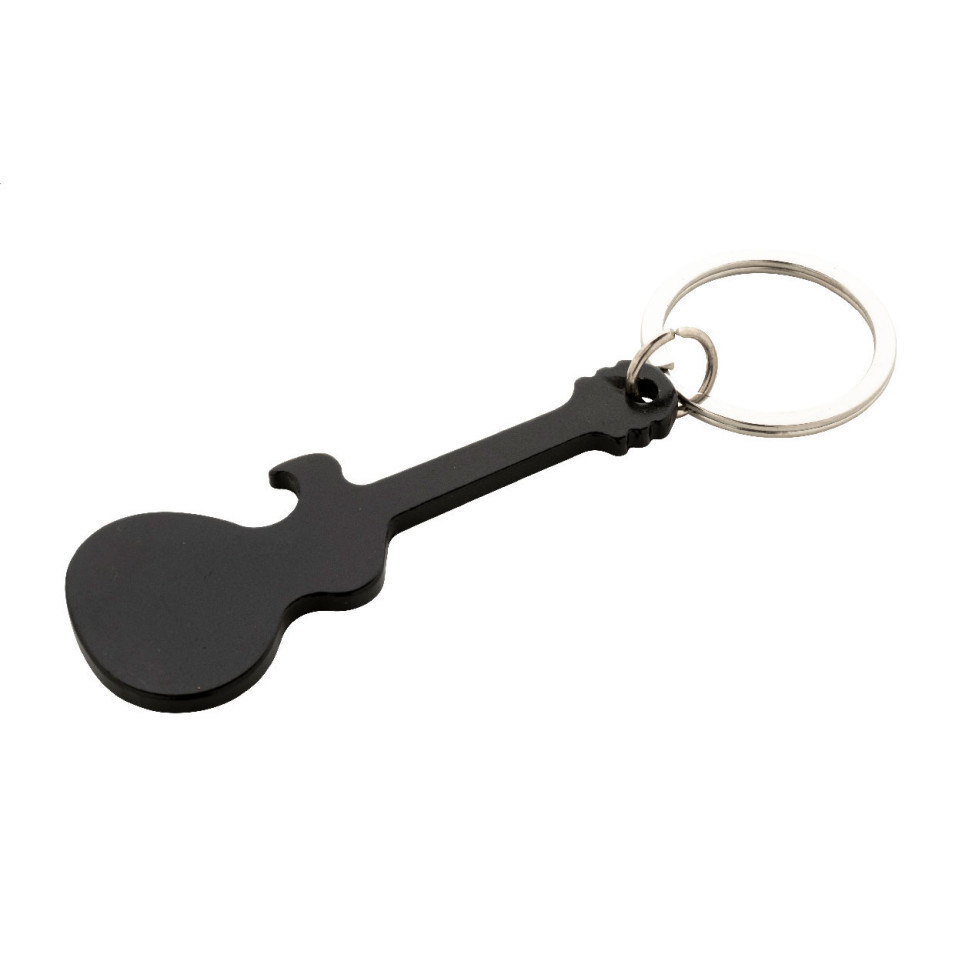 Porte-clés en aluminium noir en forme de guitare, intégrant un décapsuleur pratique. Idéal pour accompagner vos clés et ouvrir vos boissons lors de moments conviviaux, en déplacement ou au bureau.