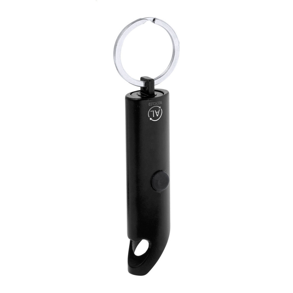 Mini lampe de poche en aluminium recyclé avec fonctionnalité décapsuleur et porte-clés intégrés. Équipée de 3 LED pour un éclairage efficace, elle combine praticité et respect de l'environnement dans un format compact.