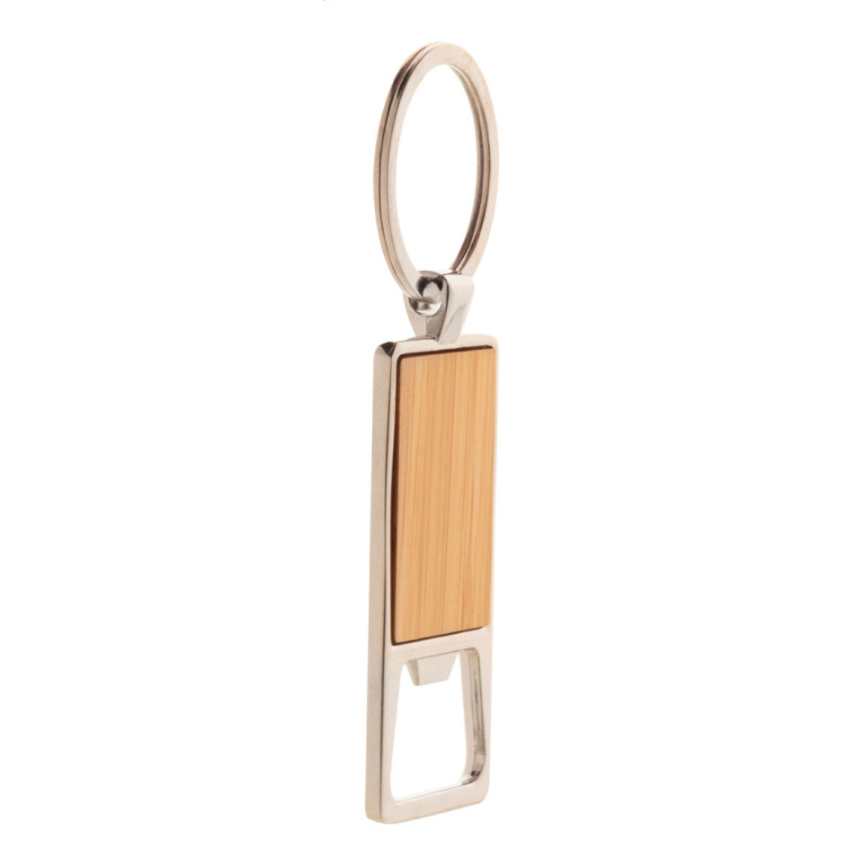 Porte-clés élégant en métal avec insert en bambou naturel intégrant un décapsuleur fonctionnel. Accessoire pratique alliant esthétique naturelle et utilité quotidienne pour tous vos besoins d'ouverture de bouteilles.