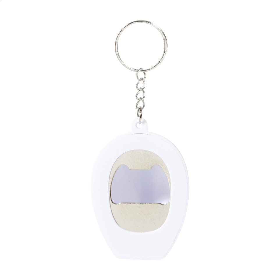 Quelle est la fonction principale de ce produit ? — Il s'agit d'un porte-clés décapsuleur, combinant deux usages pratiques en un seul objet compact.