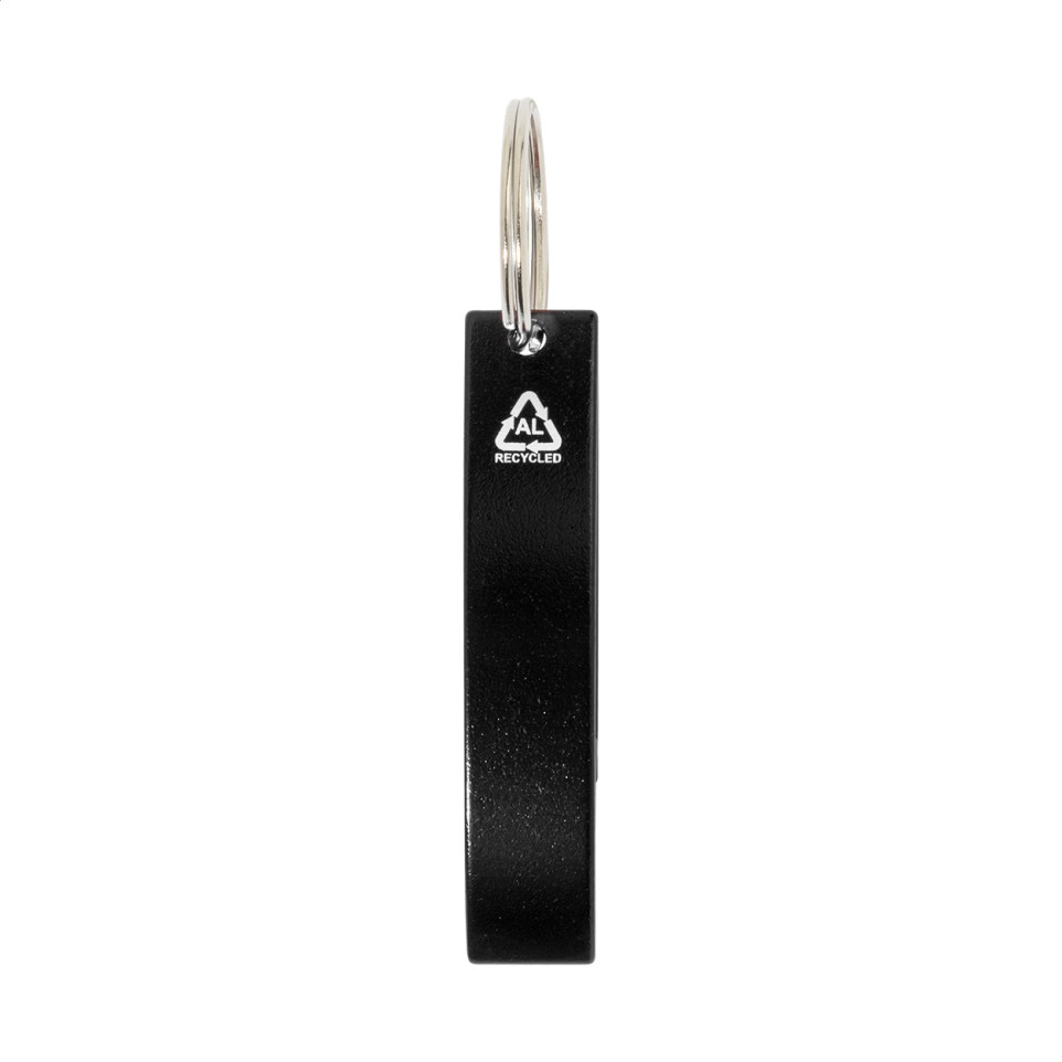De quel matériau est composé ce porte-clé décapsuleur ? — Il est fabriqué en aluminium recyclé avec un anneau porte-clés en métal.