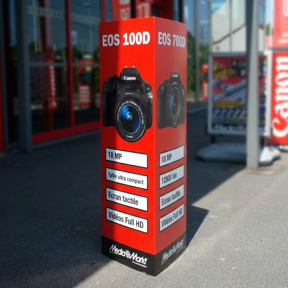 A1. Triple face, triple impact : Les trois faces imprimées en quadri assurent une communication visible à 360°, idéale pour capter l’attention quel que soit l’angle d’approche autour d’un poteau ou d’un pilier.