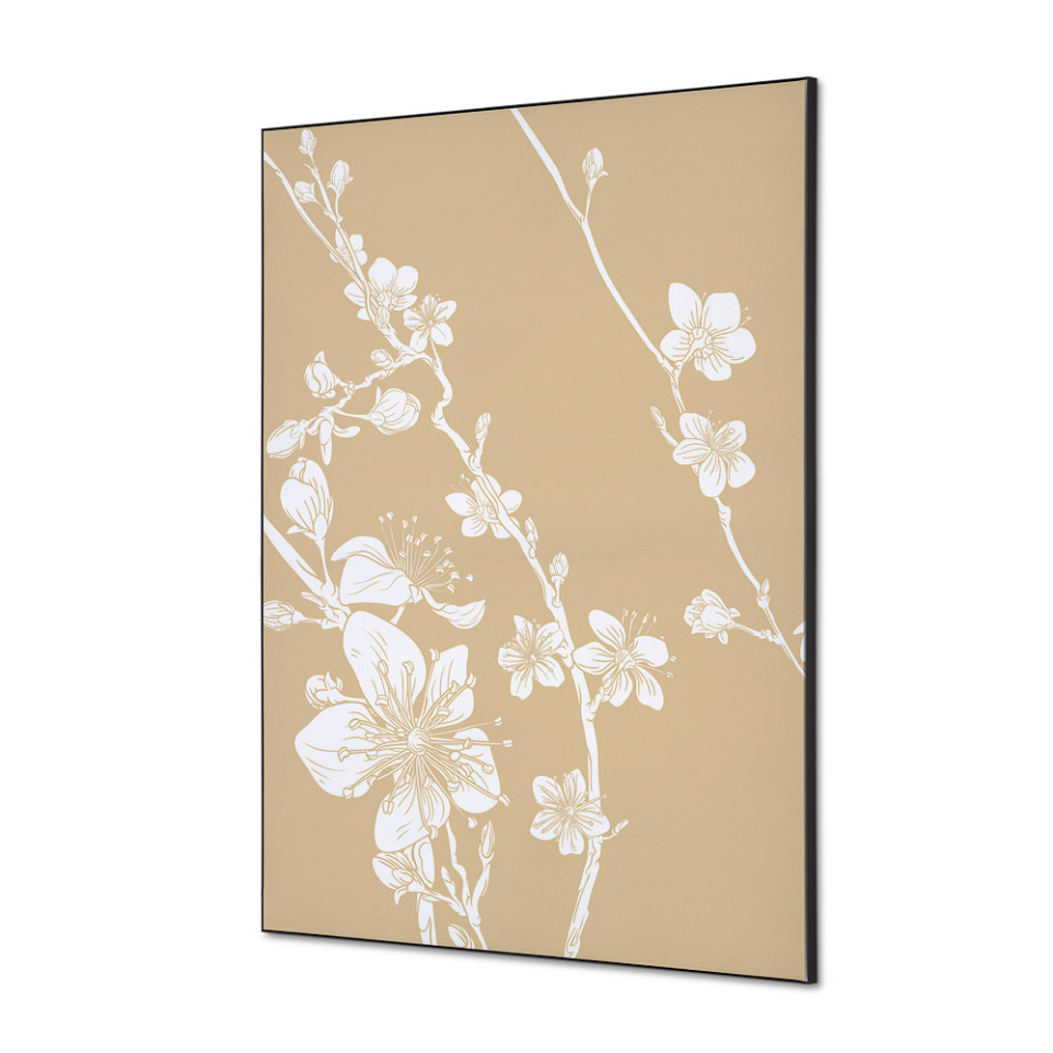 Panneau décoratif mural en tissu imprimé représentant des fleurs de cerisier japonais dans des tons beige, conçu pour habiller élégamment les espaces intérieurs professionnels ou publics.