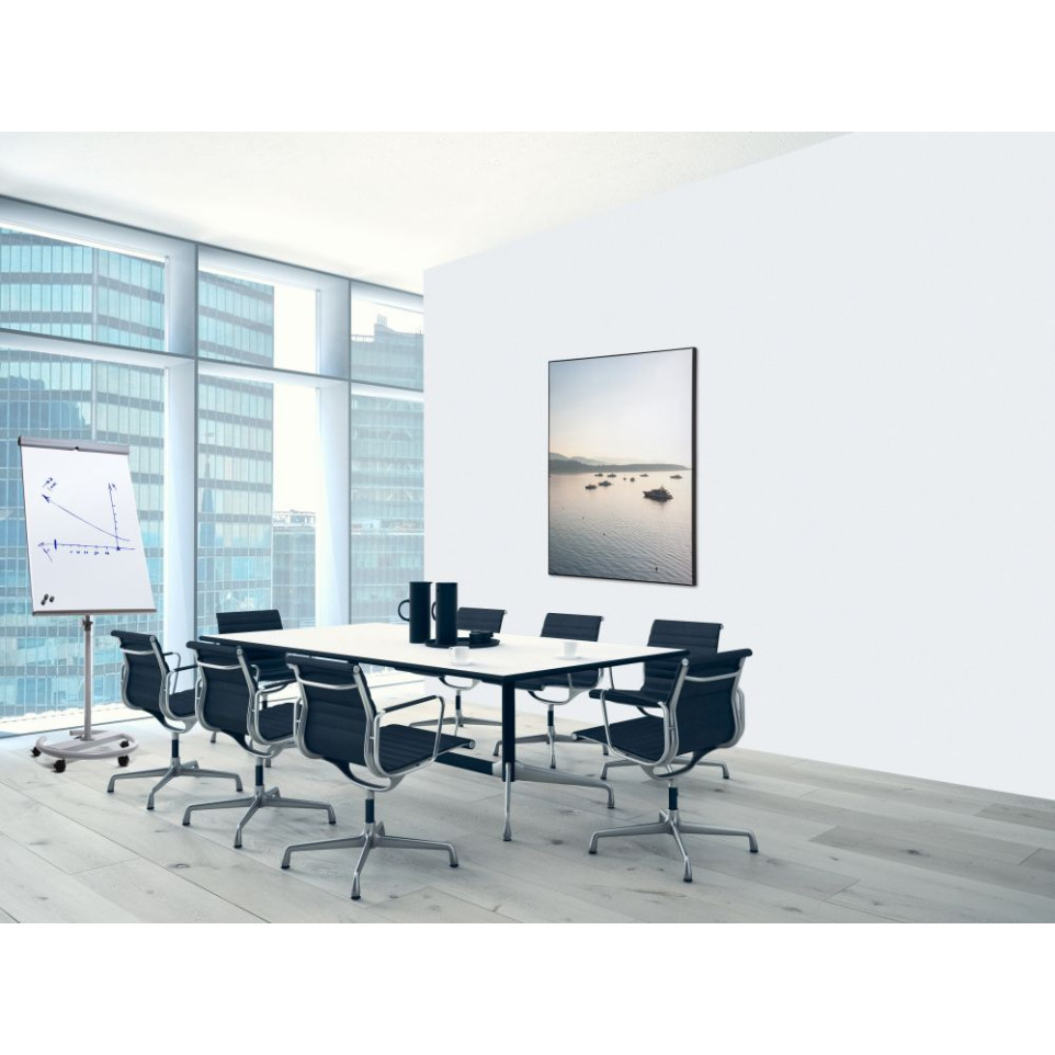 Le panneau se fixe directement au mur, sans encombrement au sol. Il convient aux bureaux, espaces d'accueil, salons professionnels et zones de vente. Sa légèreté et son format standardisé facilitent la pose et permettent une intégration rapide dans tout type d'aménagement intérieur.