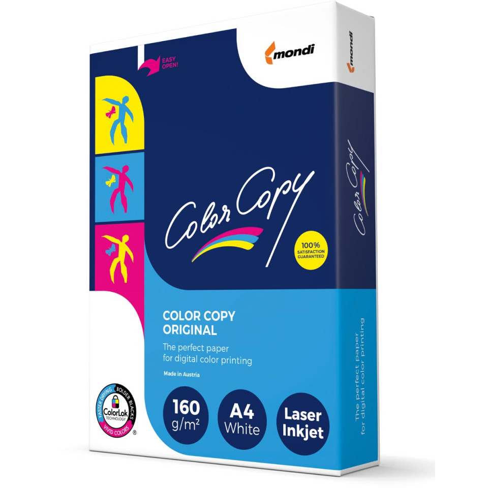 Color Copy papier d'impression A4, 160 g, est un papier blanc non couché à surface extra lisse, conçu pour des impressions couleurs de haute netteté sur copieurs et imprimantes laser. Paquet de 250 feuilles, idéal pour documents professionnels ou créatifs.