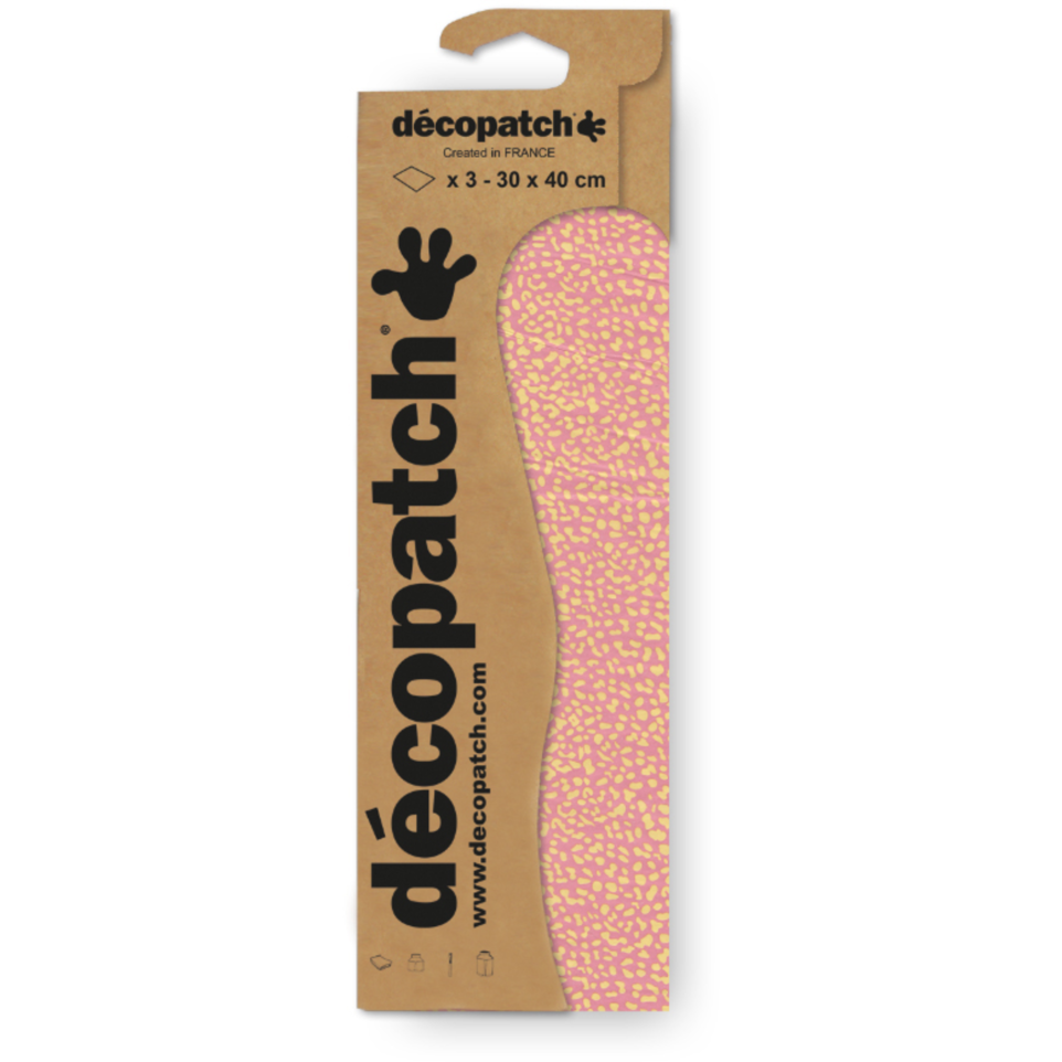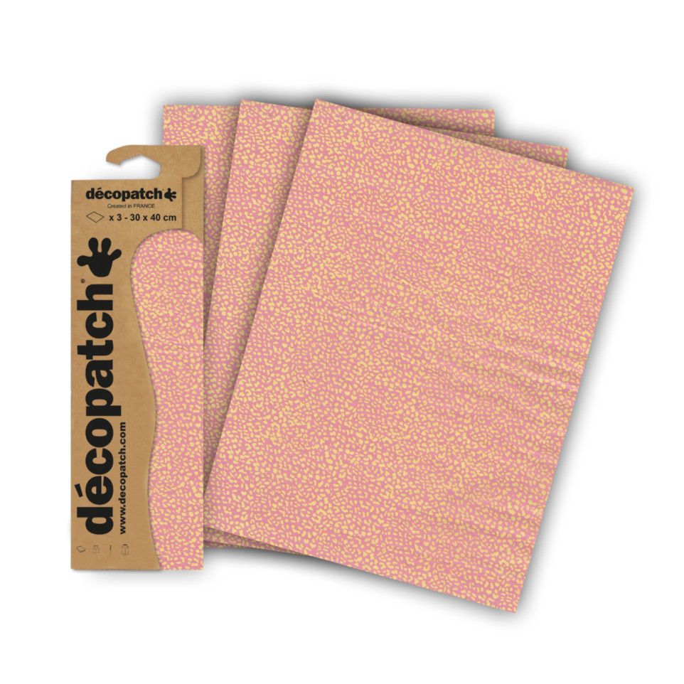 Pochette 3 Feuilles Identiques Ref 839 Le papier Décopatch épouse parfaitement la forme de tous les objets (planes ou irrégulières) et sur toutes les matières (papier mâché, bois, plastique, fer, verre, polystyrène, métal, terre cuite, céramique, liège...). Très facile à appliquer grâce à sa finesse et à sa résistance une fois encollé, le papier Décopatch est l'unique papier à donner un aspect lisse et l'illusion d'une peinture à vos réalisations ! Fini le gachis ! Redonnez vie à vos objets démodés, abîmés ou défraîchis. Technique très facile : déchirez ou découpez quelques morceaux de papier Décopatch d'environ 2x2 cm - Appliquez le vernis-colle PaperPatch de la gamme Décopatch sur le support à décorer. Déposez un morceau de papier sur la surface encollée et mettre une deuxième couche de vernis-colle par-dessus. Répêter l'opération en superposant les morceaux de papier jusqu'à ce que l'objet soit totalement ou partiellement recouvert. Enfants de plus de 5 ans ou adultes, novices ou expérimentés, la technique Décopatch s'adapte à tous les âges et à tous les niveaux ! Créé et fabriqué en France