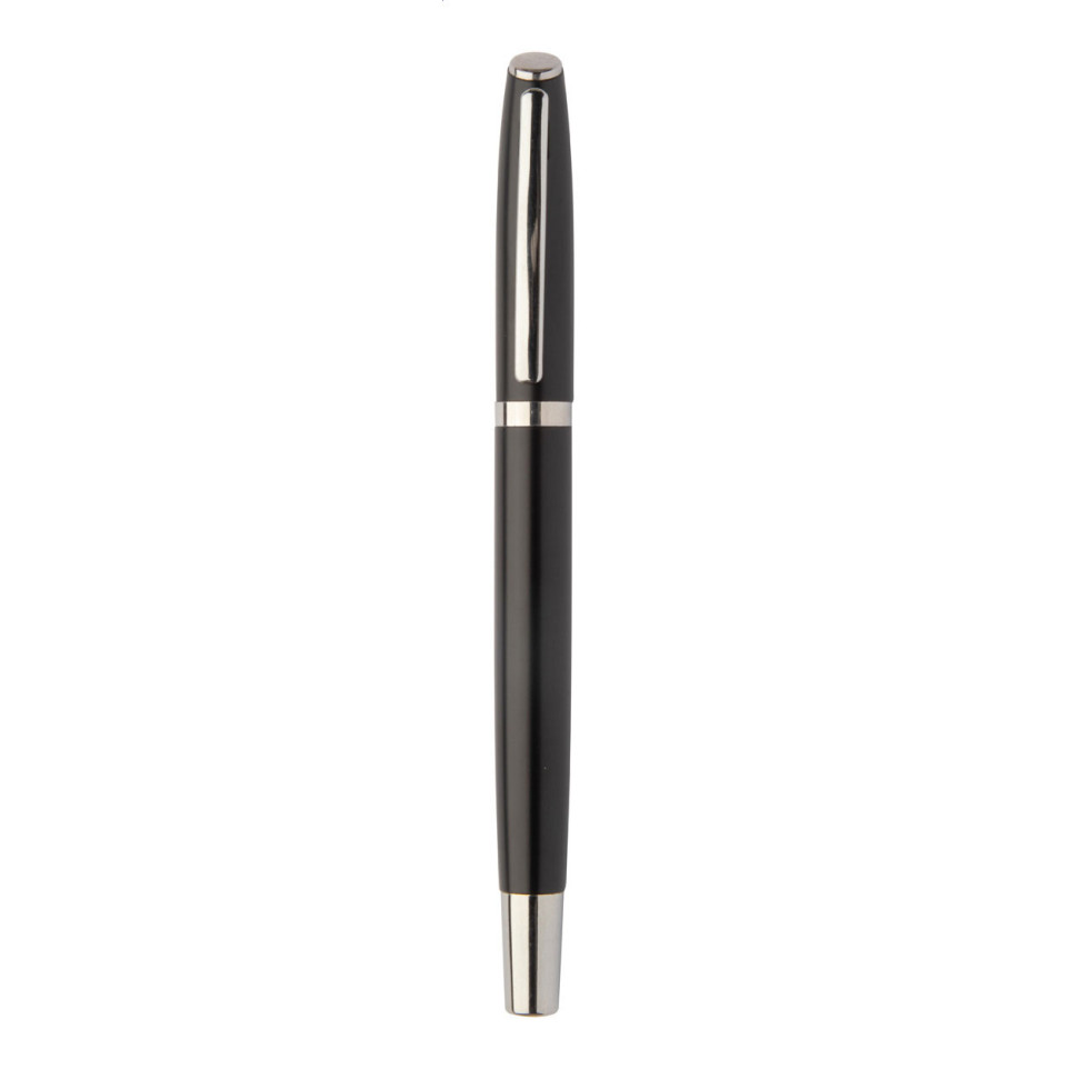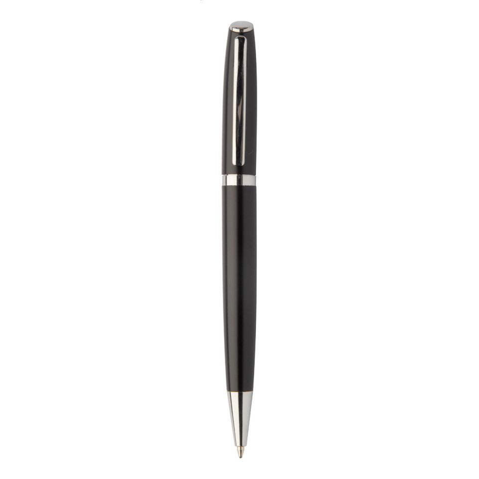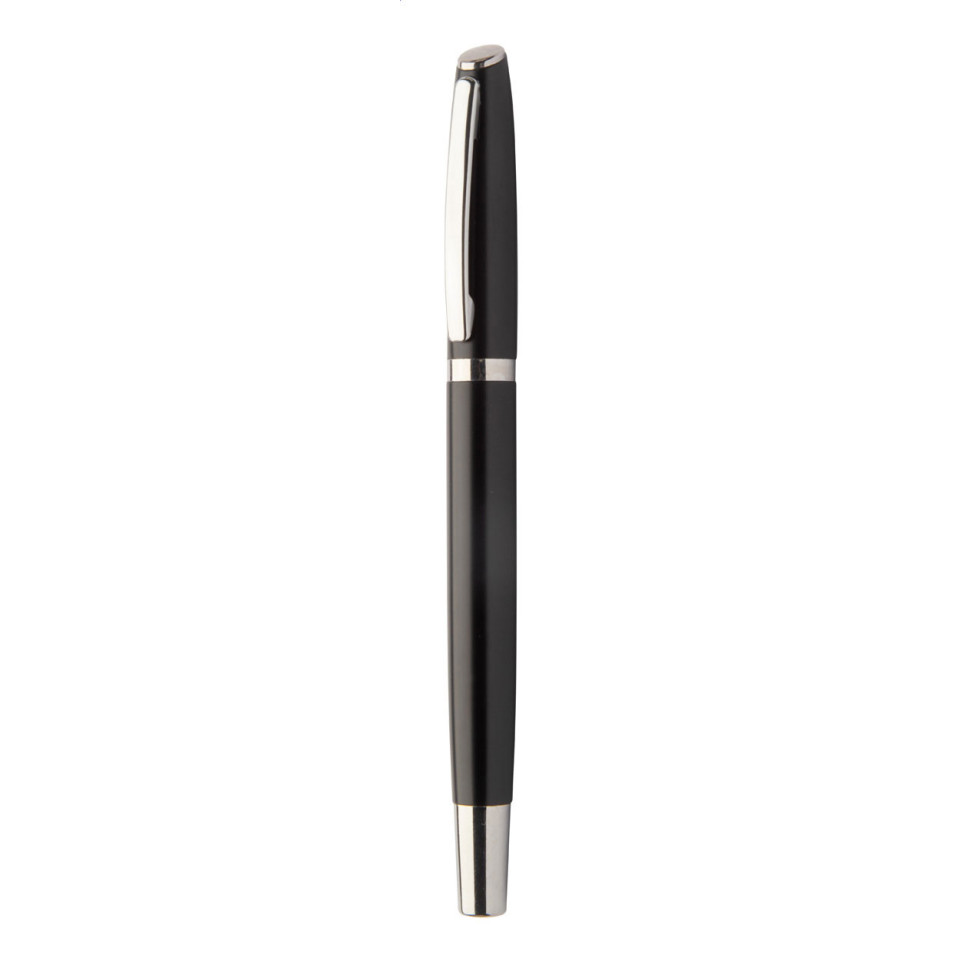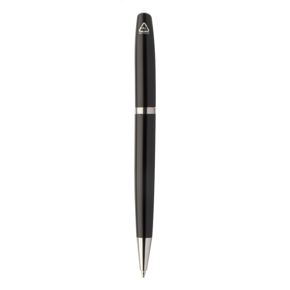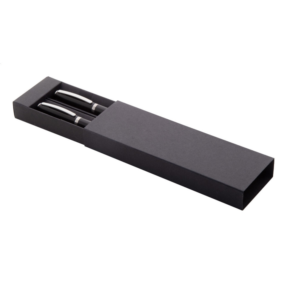 Parure de stylos en aluminium recyclé comprenant un stylo roller et un stylo bille avec encre bleue, présentée dans un élégant coffret cadeau en papier noir. Accessoire d'écriture écologique alliant style et fonctionnalité.