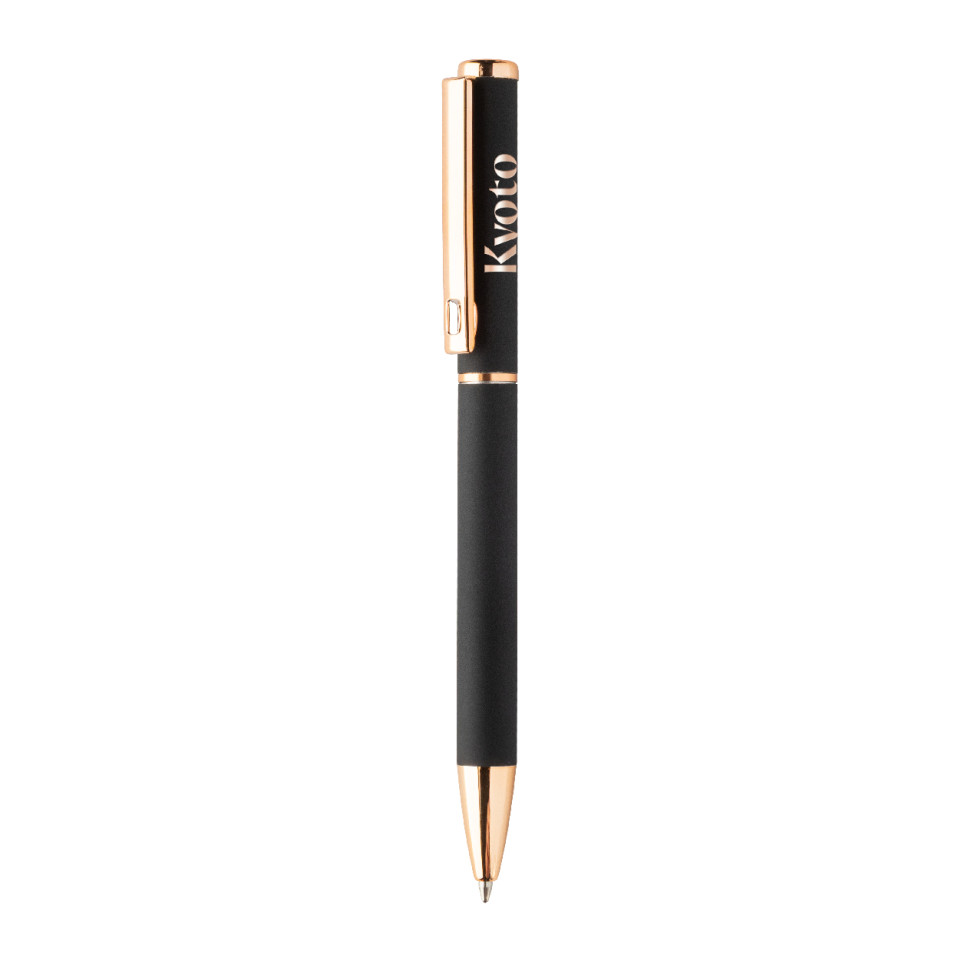 Parure raffinée composée d’un stylo à bille et d’un stylo roller, conçus en aluminium recyclé, finition caoutchoutée pour une prise en main agréable, attributs en or rosé, encre bleue, fournie dans une élégante boîte cadeau en papier noir.