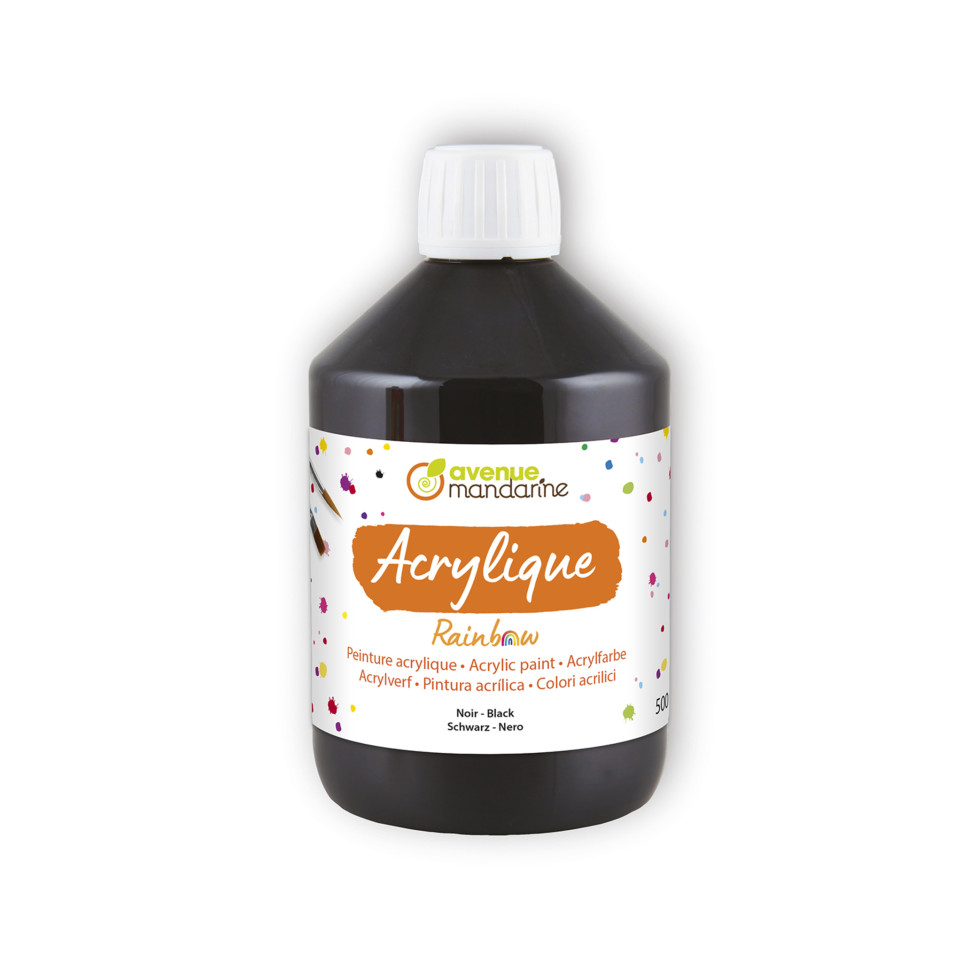 ACRYLIQUE MATE 500 ML NOIR Pot de 500ml de peinture acrylique de couleur noire. Format idéal pour les activités scolaires. Cette peinture est très couvrante et a une haute résistance à la lumière. Elle peut être utilisée sur tous les supports : papier, bois, verre, pâte à modeler Darwi, plâtre. Les 12 teintes de la gamme RAINBOW sont miscibles. Peinture indélébile après séchage, sec au toucher en 30min.